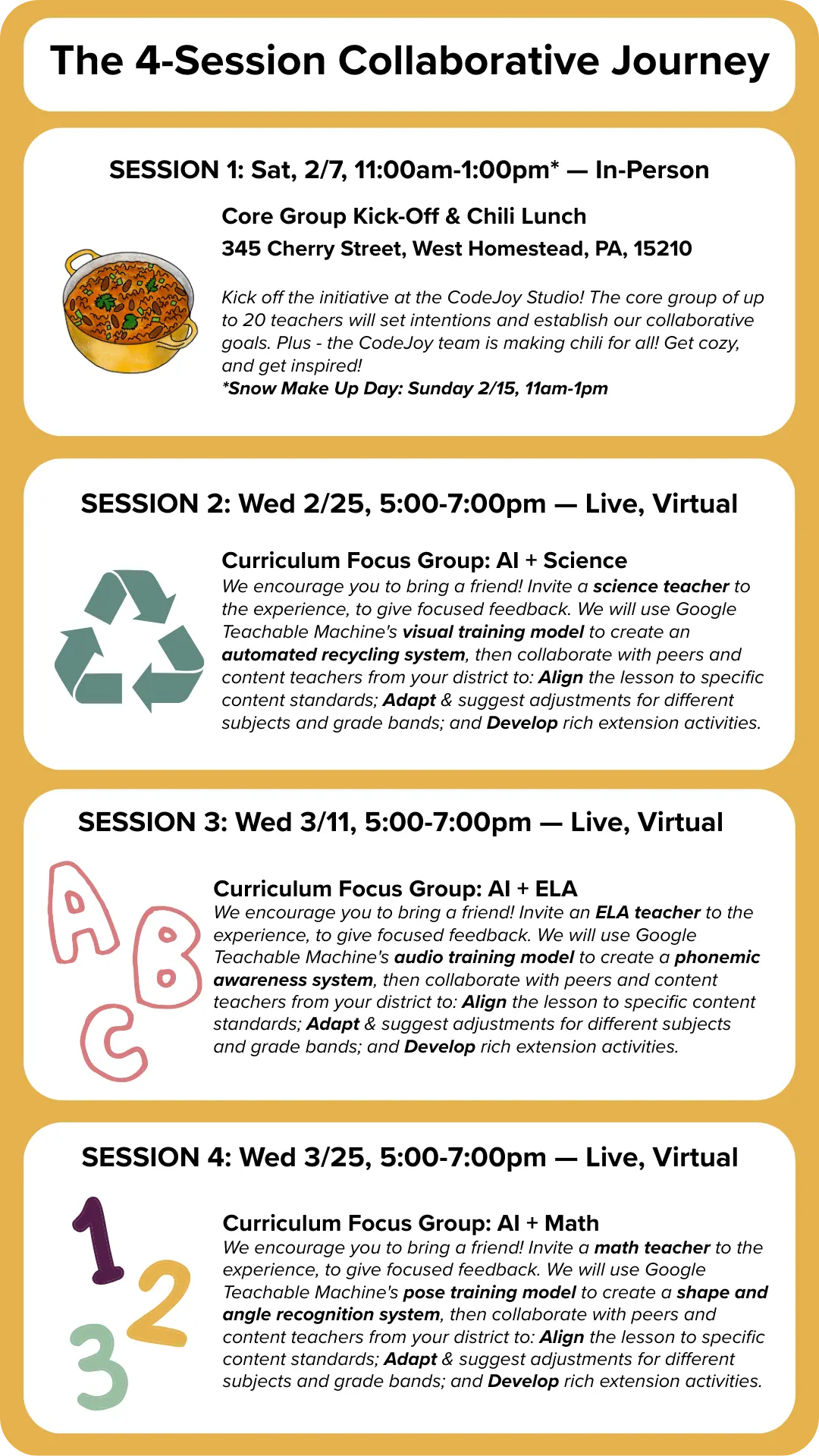 We are seeking a core group of up to 20 forward-thinking SW PA teachers, K-12, all subjects to join the AI Content Collaborative. Over the course of 4 (four) synchronous sessions (1 in person, 3 virtual) you will help develop and pilot 3 (three) content-connected AI student activities that genuinely integrate creative AI into core subject areas. This is your chance to directly influence the content and structure of professional development for the wider ABC CREATE network and beyond!